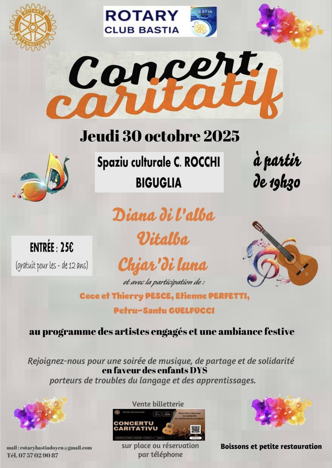 C’est un rendez-vous où la musique se met au service de la solidarité : ce jeudi 30 octobre 2025 à 19h30, le Spaziu Culturale Charles-Rocchi de Biguglia accueillera un grand concert caritatif organisé par le Rotary Club Bastia Doyen, au profit des enfants DYS, ces élèves porteurs de troubles du langage et des apprentissages souvent mal compris mais bien réels. Diana di l’Alba, Vitalba, Chjar’ di Luna, Cece et Thierry Pesce, Étienne Perfetti ou encore Petru-Santu Guelfucci se mobiliseront ainsi bénévolement pour la bonne cause.