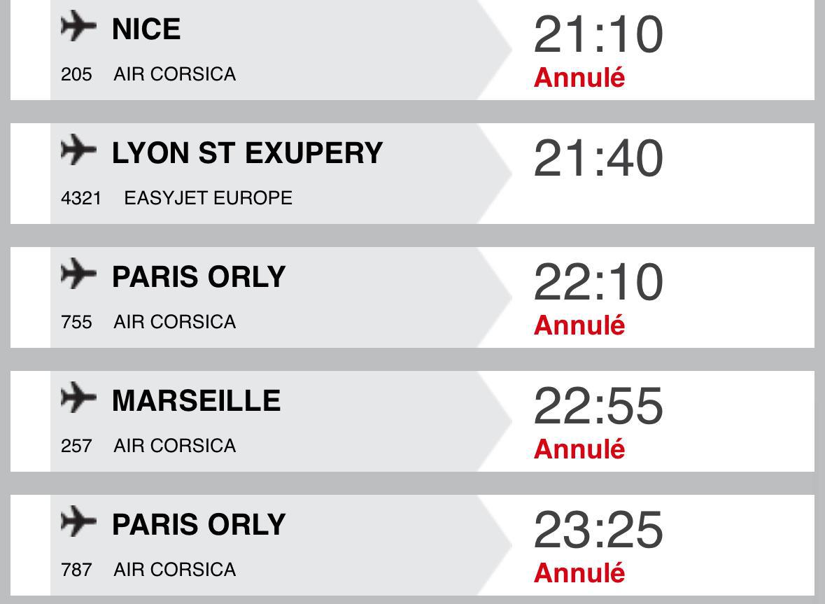 L’ensemble des vols prévus ce jeudi 12 septembre dans les quatre aéroports de Corse – Bastia, Ajaccio, Figari et Calvi – ont été annulés à partir d’environ 17 heures. Ces perturbations affectent tous les trajets entre l'île et le continent, selon les sites des aérogares gérées par la Chambre de commerce et d'industrie de Corse qui permet de suivre les vols en temps réel.