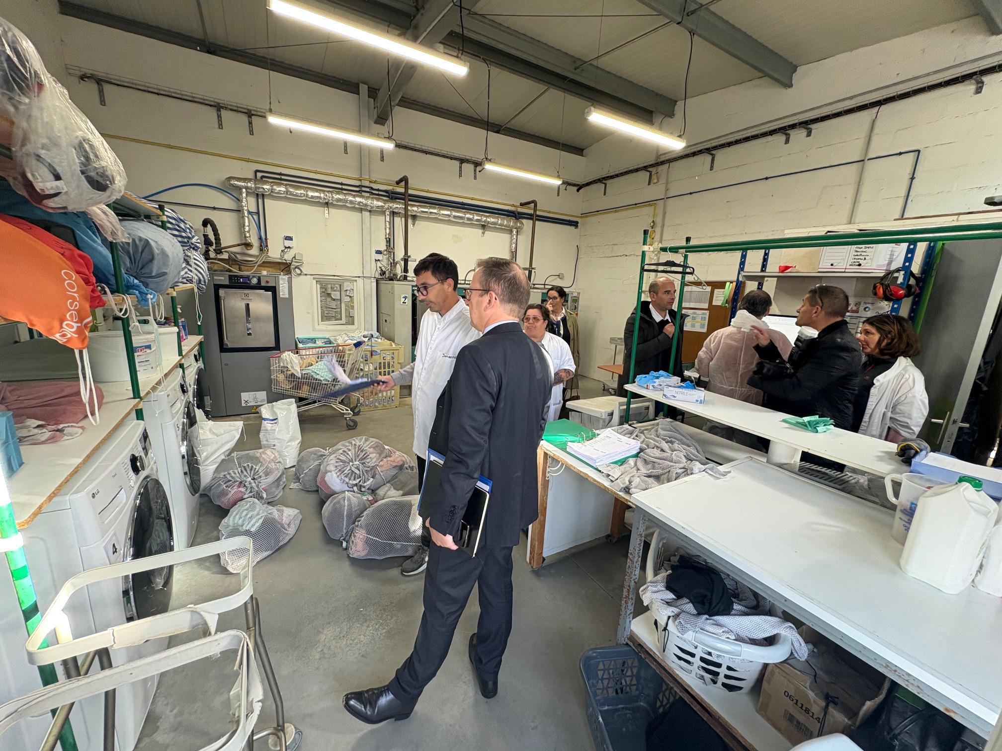 Marie et Sandra, responsables de la production à la blanchisserie, ont, quant à elles présenté aux représentants de l'Etat, un atelier de blanchisserie performant, ancré dans le tissu économique local. Les équipes assurent lavage, repassage, emballage et livraison pour une clientèle diversifiée : les hôpitaux d’Ajaccio et Casteluccio, des gîtes, un centre de vacances à Porticcio, ainsi que plusieurs professionnels (boucherie, coiffeur) et des particuliers, dans cadre stable et structurant pour les travailleurs en situation de handicap.