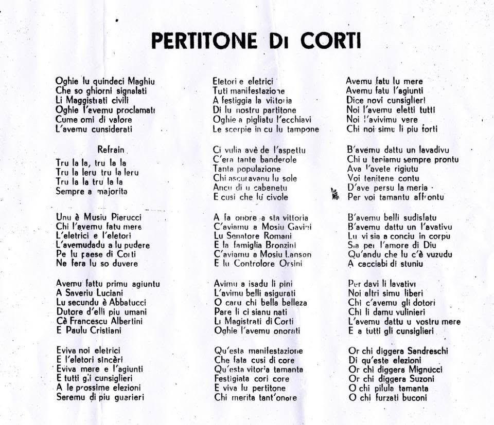 Pour illustrer ce registre comique et rester dans la traditionnelle magagne cortenaise, s'y rajoutaient les fameuses joutes verbales empreintes de charges satyriques exceptionnelles. Chaque élection voyait fleurir son lot de chansons. Si pour le Partitone les textes sont restés dans la mémoire collective avec le truculent "Trulala", en revanche et pour ce qui concerne le Partitellu, on recherche encore son risible "Richichi". Il est vrai qu’il fut peu chanté puisque le « parti minoritaire » n’a eu que très peu l’occasion d’accéder à la mairie, si ce n’est dans l'après-guerre, entre 1945 et 1955, « lorsque fut élu Jean-Baptiste Sandreschi à la tête de la commune. Mais dès 1955, le Partitone revenait aux affaires avec l’élection de Toussaint Pierucci, ancien Partitellu », se souvient Daniel Coulon-Cerani.