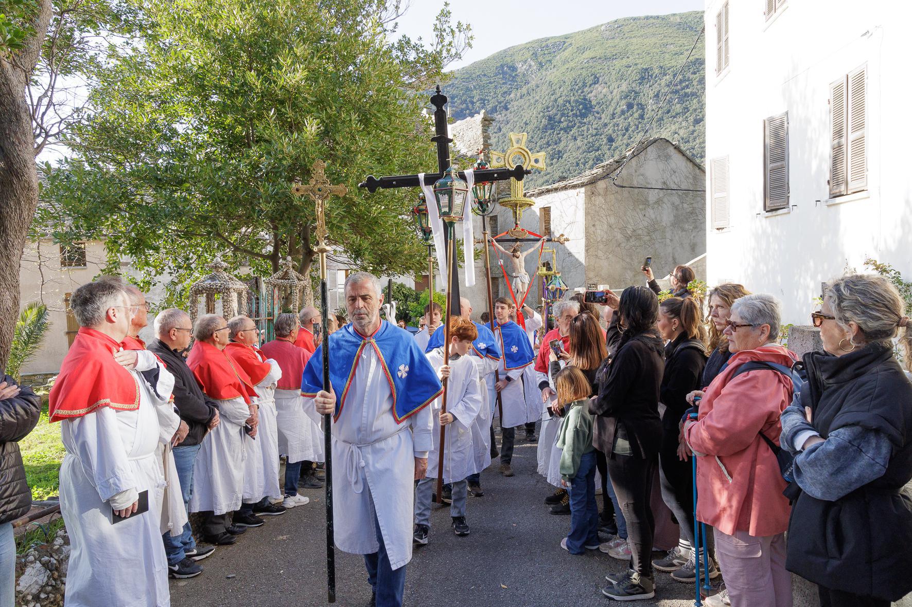 Au matin du Vendredi saint, la pieve de Lota ne ressemble plus à tout à fait à elle-même. Le silence s’impose, à peine troublé par les voix graves des prieurs des confréries . Dans les chemins, sur les placettes, entre les maisons encore closes, les processions précédées des porteurs de croix, s’ébranlent lentement depuis San Martino, Figarella et Mandriale sur un parcours dont l’origine se perd fans la nuit des temps. Elles avancent sans hâte, comme si le temps s’était retiré avec la nuit.