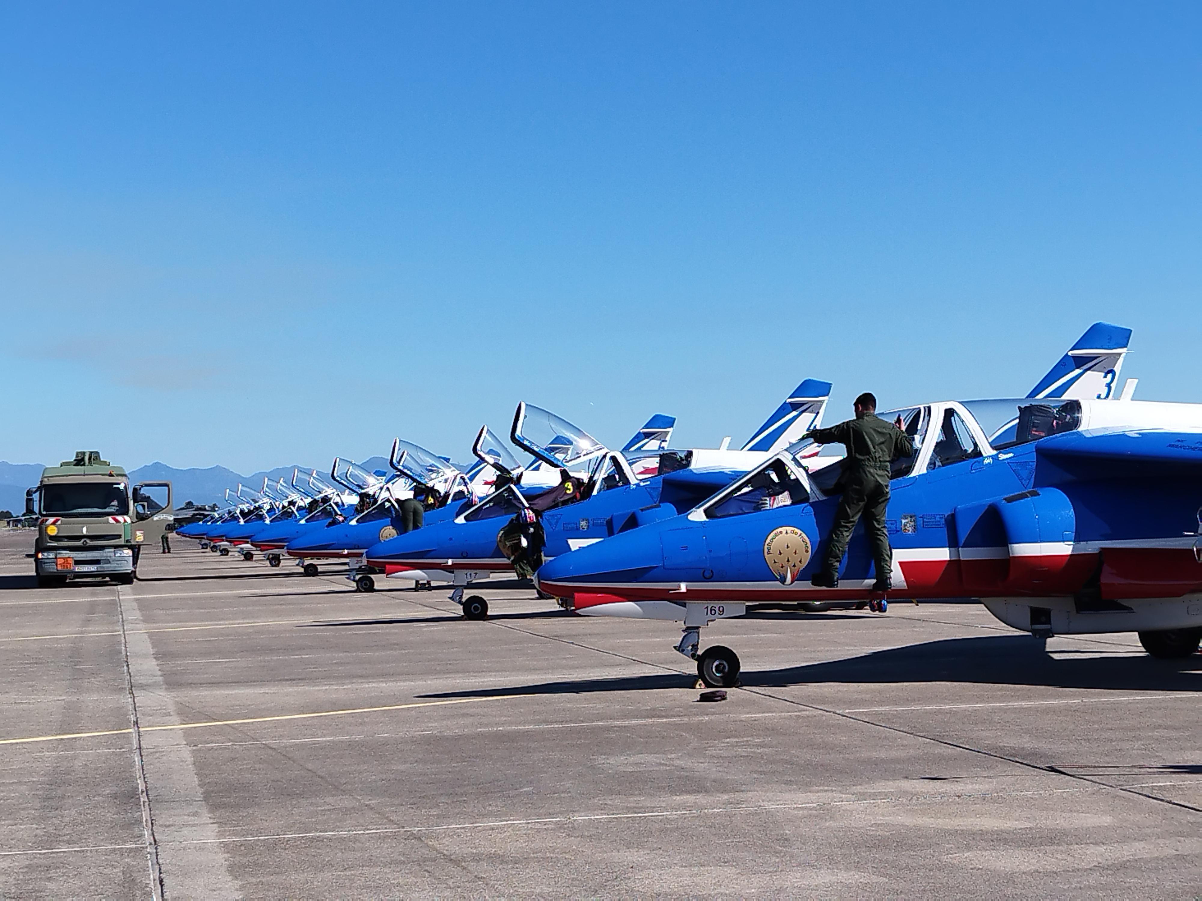 « Je vous signale un effet miroir possible avec une mer d’huile ». Posté sur la plage située derrière la BA 126, le commandant Stephen (1) donne ses dernières instructions aux huit pilotes d’Alpha Jet de la Patrouille de France. En réalité, ils seront neuf à décoller de la base ce mardi matin, le neuvième tournant autour des huit autres pour les prendre en photo. L’un des pilotes signale un léger contretemps : « J’ai deux abeilles dans le cockpit... » Le départ est retardé de quelques secondes, le temps d’ouvrir la verrière pour chasser les butineuses.