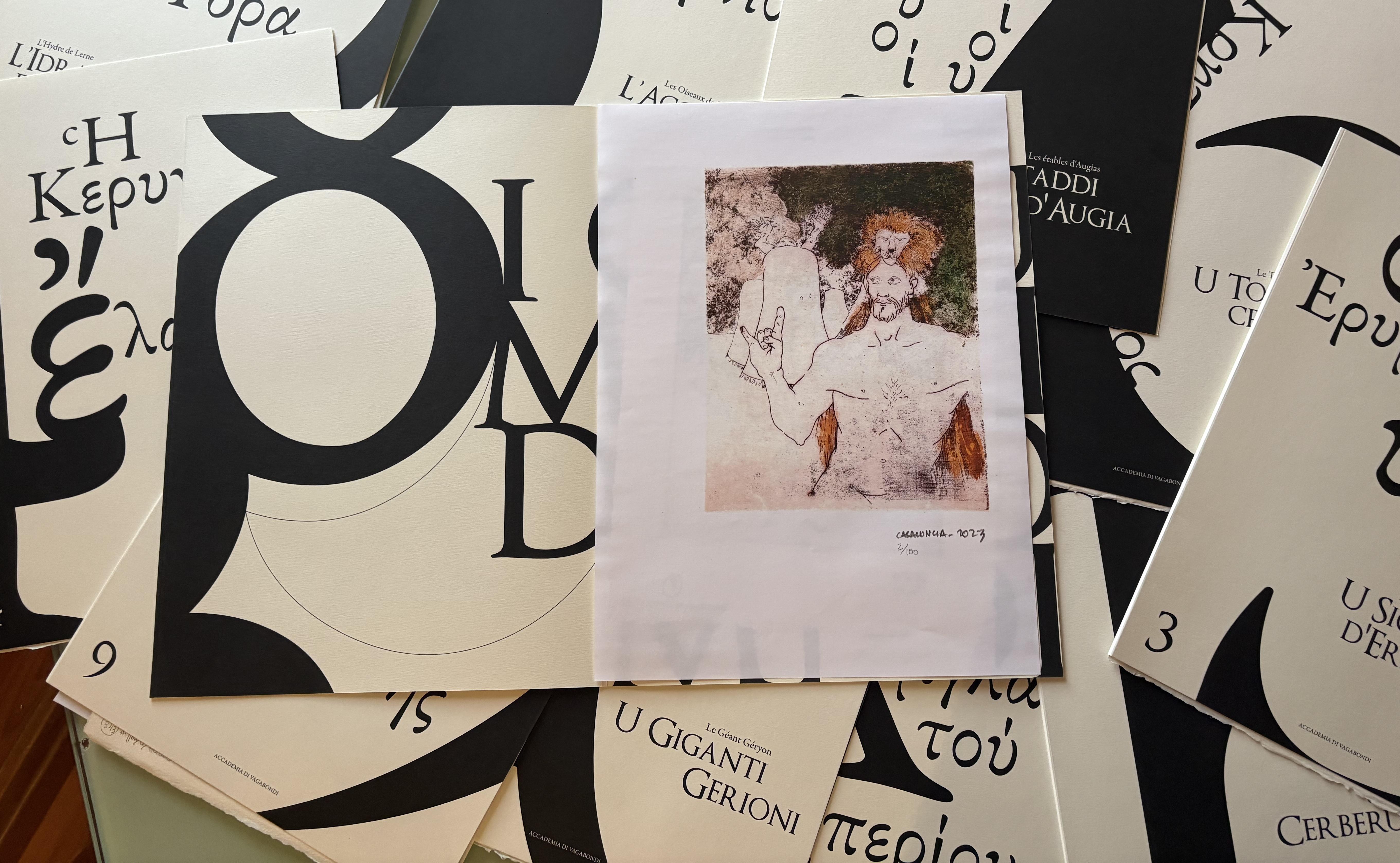 L’artiste balanin a tout d’abord gravé ses illustrations dans le métal puis a poli les moules à l’eau plate avant de les ancrer. Il a ensuite demandé à l’écrivain bastiais Gilles Zerlini de mettre des textes dessus, déclenchant un nouveau processus de création. « En fait, c’est un travail à l’envers de celui qui a coutume d’être fait, puisque c’est l’auteur qui demande à un dessinateur d’illustrer son texte » commente Gilles Zerlini. «J’ai donc composé 12 poèmes en vers libres, traduits ensuite en corse par Anghjulu Canarelli. Je n’ai pas voulu m’inspirer profondément des gravures de Toni et j’ai relu les travaux d'Héraclès et j’ai fait des parallèles. Par exemple dans l'Hydre de Lerne j’évoque Pasolini, pour le Sanglier d'Erymanthe j’aborde l’agriculture industrielle, les Oiseaux du lac Stymphale m’ont rappelé les bombardements de Bastia en 1943, les Juments de Diomède sont une parabole sur la société qui se détruit. Cet ouvrage qu’on a réalisé avec Toni Casalonga entre en résonance avec un bouquin de 1960 : "Les Bucoliques de Virgile" dont les traductions en corse et en français avait été effectuées par Carulu Giovone da Bozi, originaire de Zonza. Et illustrées par le tout jeune Toni Casalonga ».