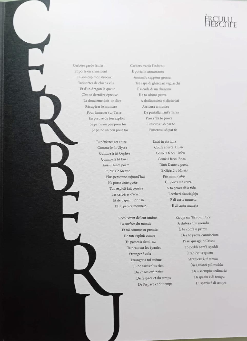 Le résultat est d’autant plus sublime que l’ouvrage, en couleurs, est au format A3. 12 cahiers, indépendants, chacun présentant une couverture en noir et blanc avec le titre en grec, français et corse. A l’intérieur une page pour l’illustration, faisant face au texte correspondant en français et en Corse. A chaque page l’un des 12 travaux. Outre ses clins d’œil, l’auteur Gilles Zerlini a aussi dissimulé des codes ! Aux lecteurs de faire preuve de perspicacité, un travail qui n’a rien … d’herculéen ! Enfin, signalons la belle préface du poète, linguiste, philosophe, dramaturge Rinatu Coti.